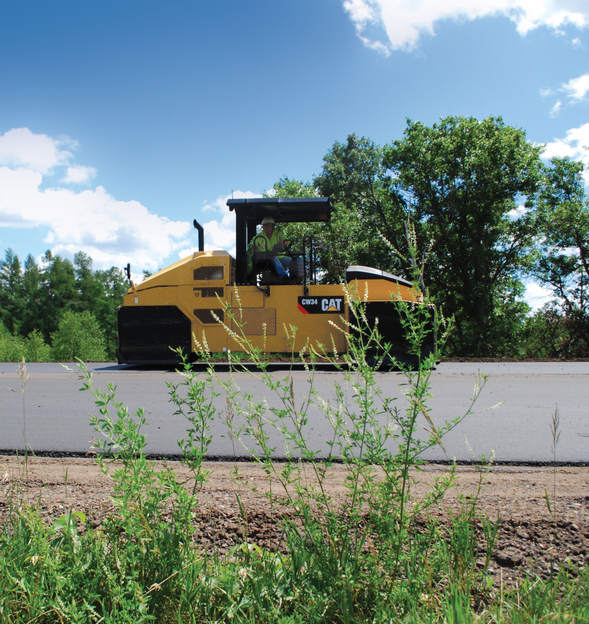 The CW34 is an eight wheel pneumatic roller that features a modular ballast system and flexible operating weight of 10 000 kg to 27 000 kg (22,050 lb - 59,525 lb). This machine offers excellent visibility, ECO-mode operation, even compaction, and excels on a variety of materials due to its flexible air-on-the-run capability.