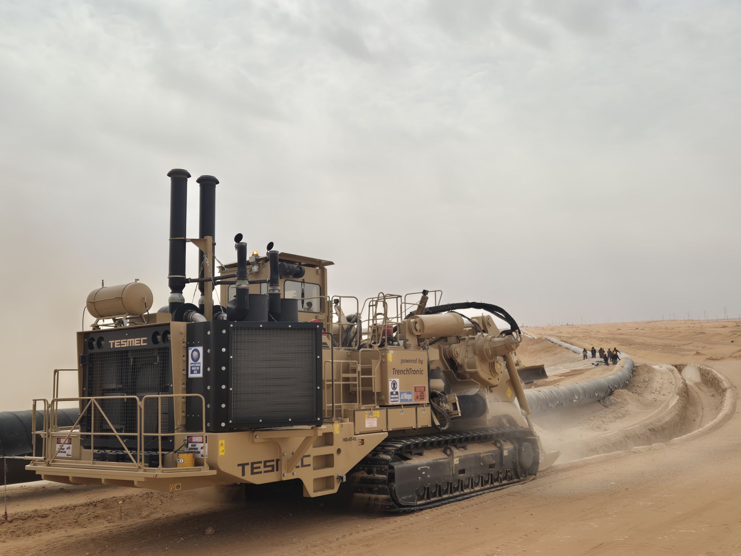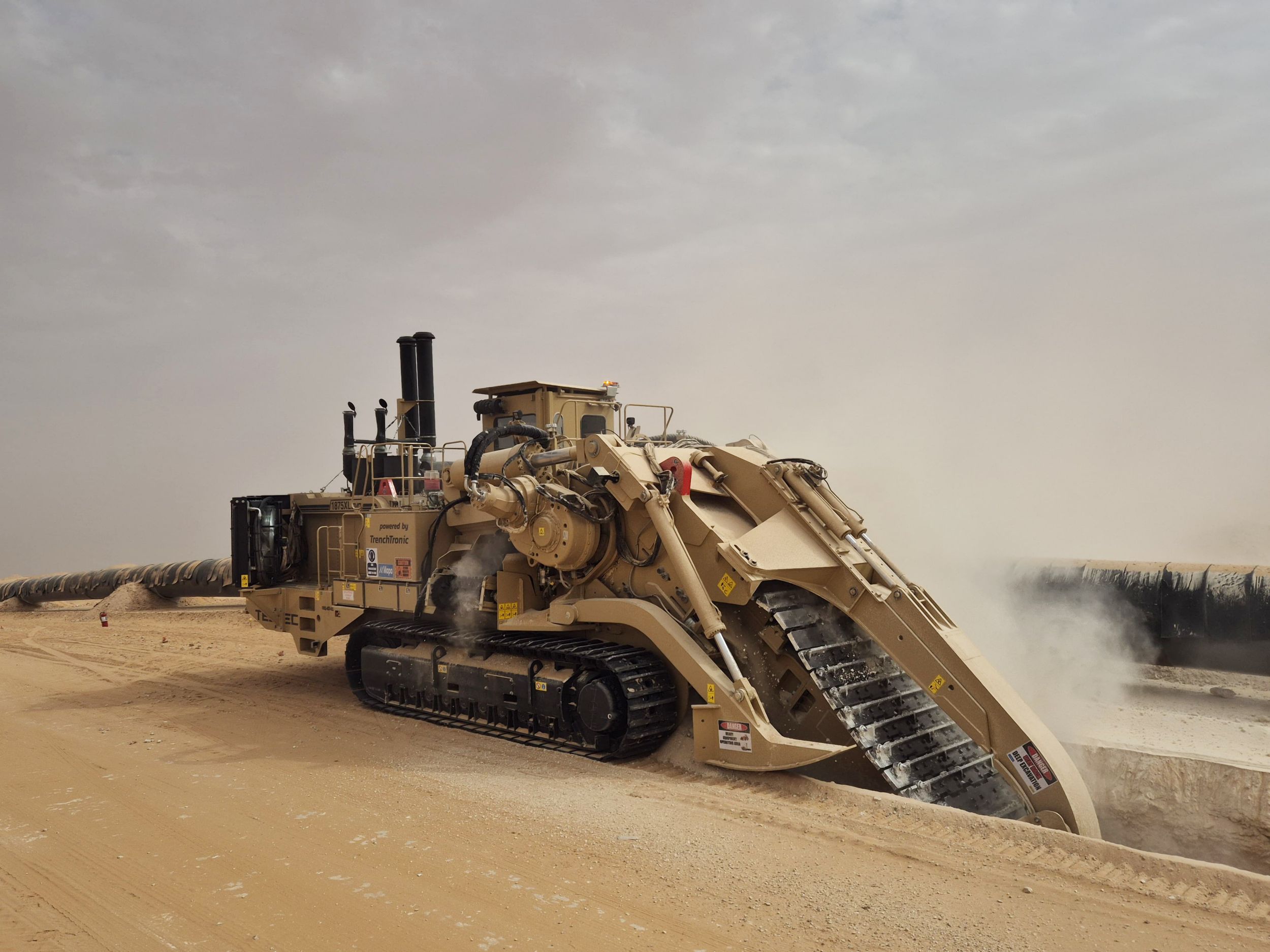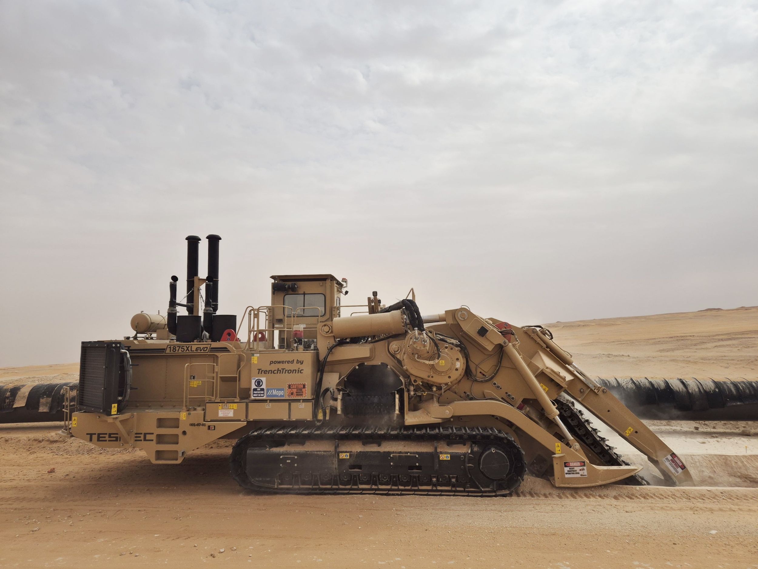 Tesmec started developing the 1875XL EVO Chainsaw Trencher in 2022. Released in 2023, it’s an innovative trencher, specialising in deep trenching for large-diameter pipelines. The massive, 160-ton machine can dig trenches up to 732 cm deep and 213 cm wide, surpassing industry standards. Some 1875XL EVO machines are tasked to work around the clock, producing trenches for big oil gas pipelines.